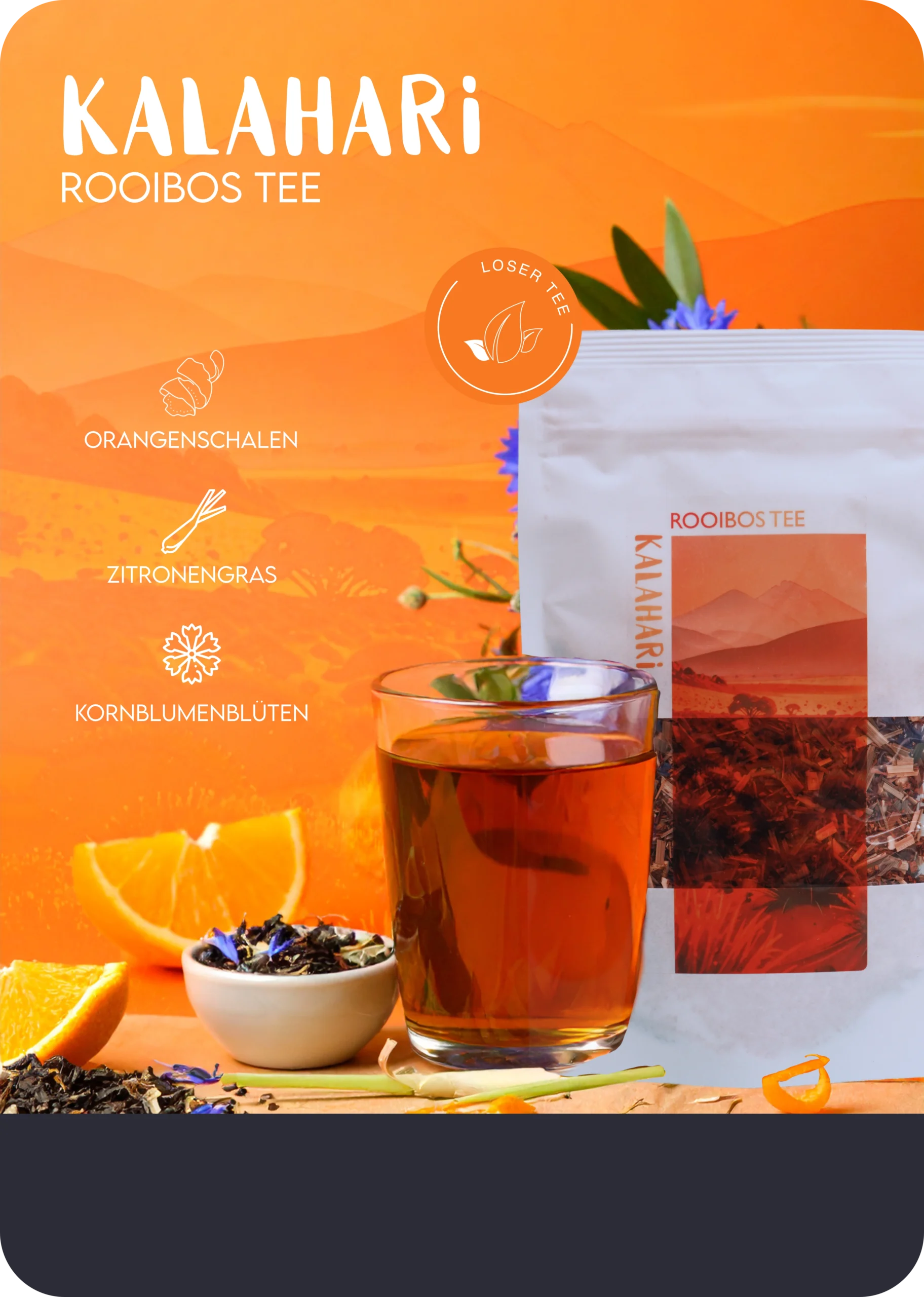 Rooibos (Südafrika), Zitronengras, Orangenschalen, Orangenöl, Kornblumenblüten